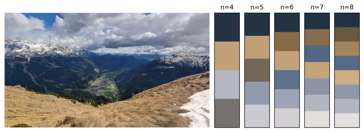 because sklearn.clusters.KMeans is a quick and easy[2] method of identifying groups (clusters) within n-dimensional datasets, that’s what i used. before tackling the (slightly) harder task of finding average clusters within different regions of an image (as above), i first identified clusters from a single image (fig 3). and by choosing an image that isn’t too colourful, the cluster centroids end up making a reasonably nice sequential[3] colour scheme. after that, it was straightforward enough to drop in any other image i wanted (fig 4 & fig 5)