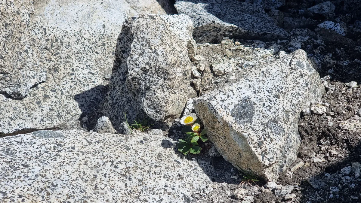 The path picks up the surprisingly sharp ridge of a lateral moraine[21], before then becoming very bouldery with no obvious route through. A few sad-dirty snow patches are all that remain of Ghiacciaio di Monte Nero. Crampons not required. An image comes to mind, and I make myself giggle: aspiring to be some sort of rugged mountaineer—hyper-masculine—with gear and the requisite know-how, but actually just being a bit too much like Theresa May on holiday. Around ~3000 m are the first few stemples and cables. Nothing to airy, but the via ferrata helps keep you safe up and over Bocchetta di Monte Nero (3120 m). I pass a number of geological features (Fig. 2) that I can't fathom: the very blocky fractures; small patches on the tonalite where the mineral grains look to have been sheared smooth; is that a roche moutonnée or a whaleback? I'm quite sure those are striations. Was that a subglacial meltwater channel? Not knowing, not having any confidence in things-i-should-know prickles and chips away at my already eroded confidence.