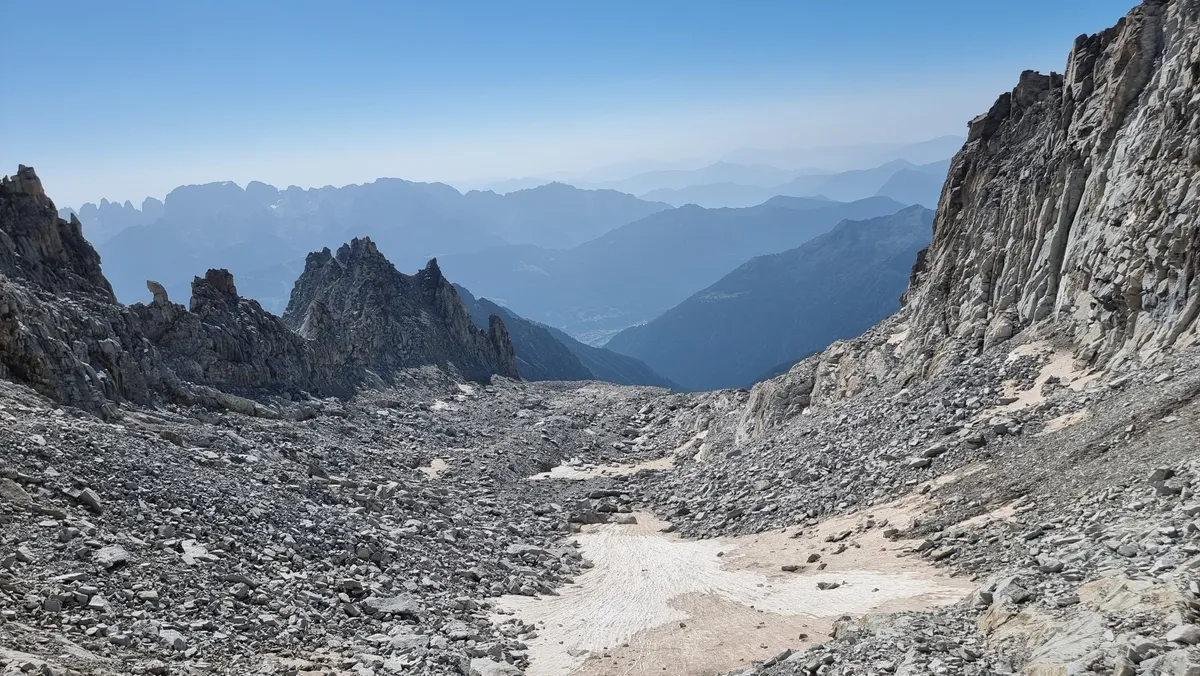 Parking the car at a little under 2000 m a.s.l. a little before local sunrise[20]. I set off up Val d'Amola. The sharp and jaggy peaks of the Brenta group perfectly silhouetted behind me. Not a cloud in the sky. It was going to be a warm day. Barely 30 minutes in and I step across the terminator and into the sun. The path is not too steep, well-trod, and way-marked with red and white stripes daubed on rocks. 50 minutes and 400 m of vertical after setting off, I attain Rifugio Segantini (2373 m). Only 1200 m to go. A group of ~10, each with a little running vest-rucksack and short shorts left the Rifugio just ahead of me. As they run-walk-trotted in front me I felt silly for over-packing. They didn't have harnesses, or crampons. I started to get a bit cross with myself. A few minutes later the runner at the back called to those at the front...they were on the wrong path. I greeted them all as they cheerfully back-tracked. Continuing, I felt relieved that I'm not the only one who makes silly, easily-avoided, mistakes about which way to go.