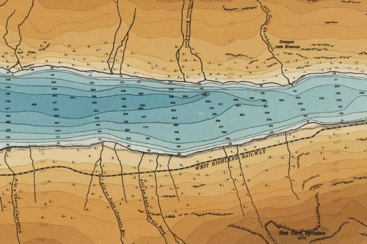 Loch Treig was dammed in 1929 (dam not shown in Fig 0). After a quick glance at a few other OS map sheets I think I can say with some confidence[2] that the Ordnance Survey have chosen not to put bathymetric contours on bodies of water that have a dam.